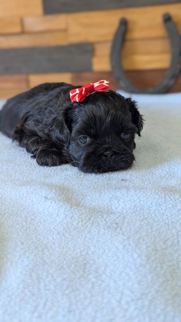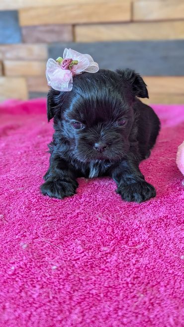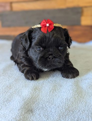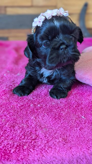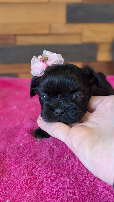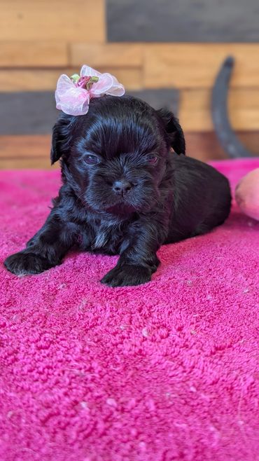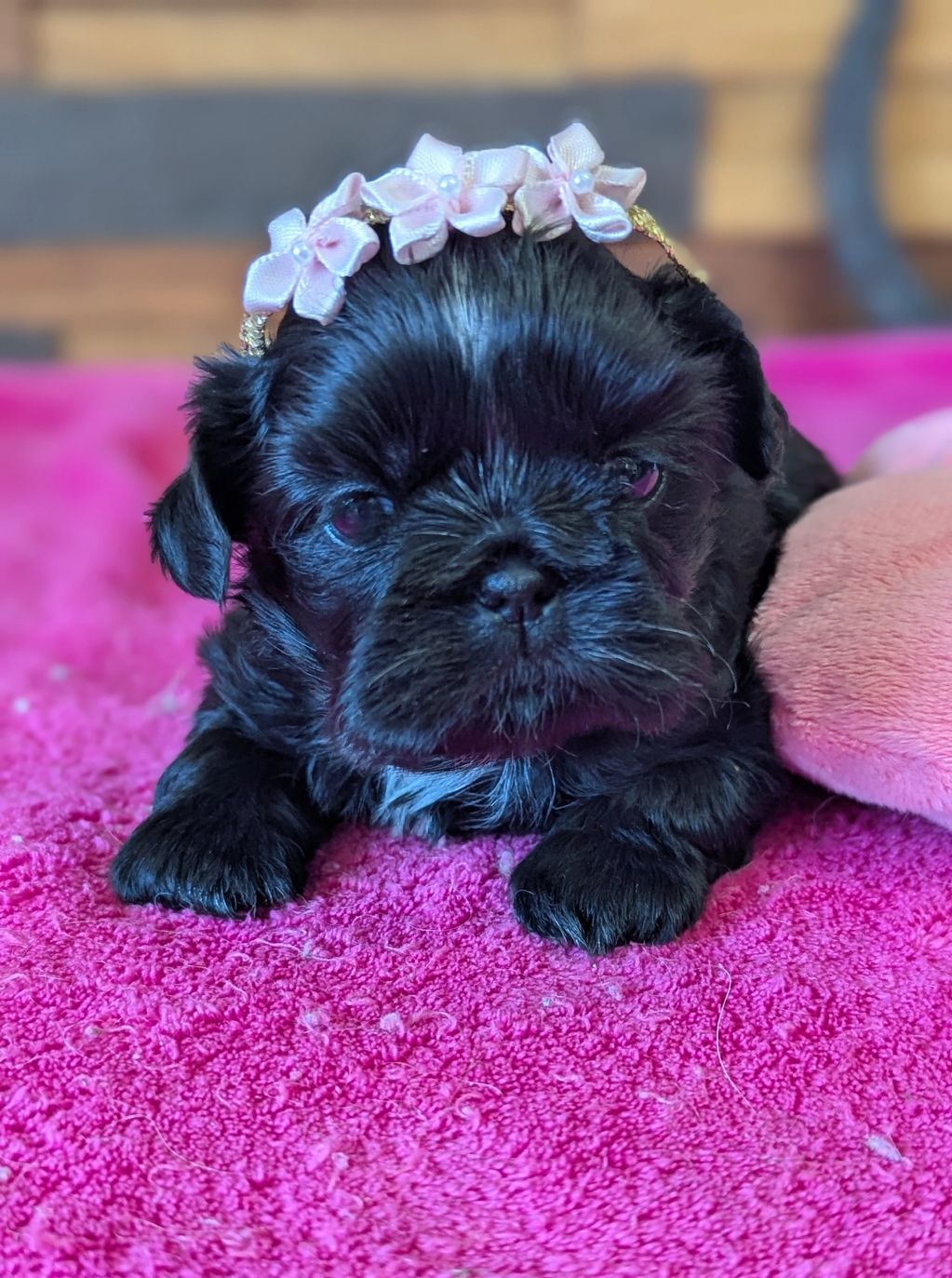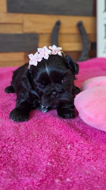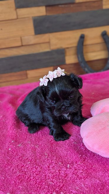 Meet Beau! He's a solid black shih Tzu puppy boy with a tiny white on his chest. He weighs 1 lb 10 ounces at 3 weeks and should mature around 9 lbs. Ready Weds before Thanksgiving.