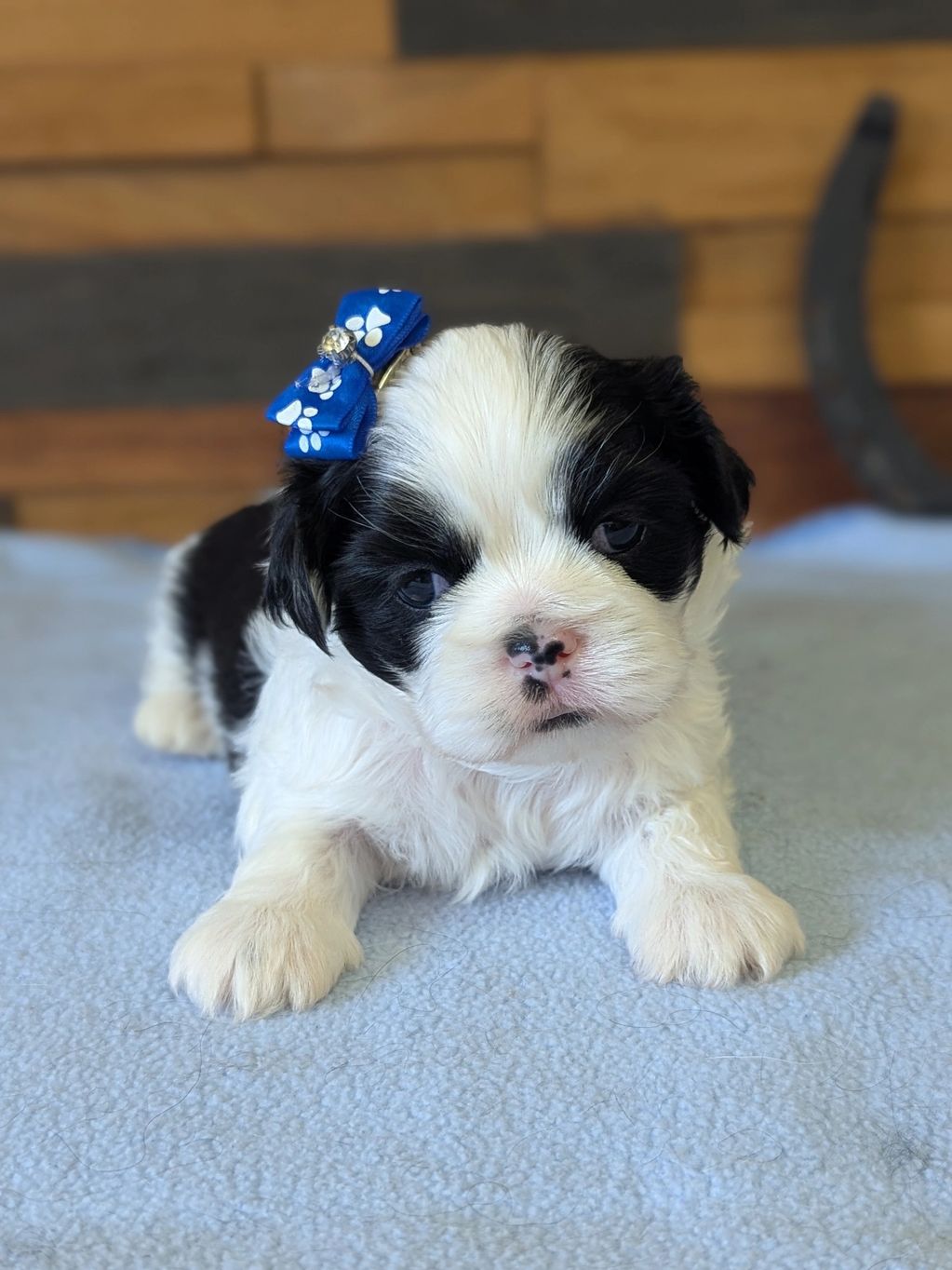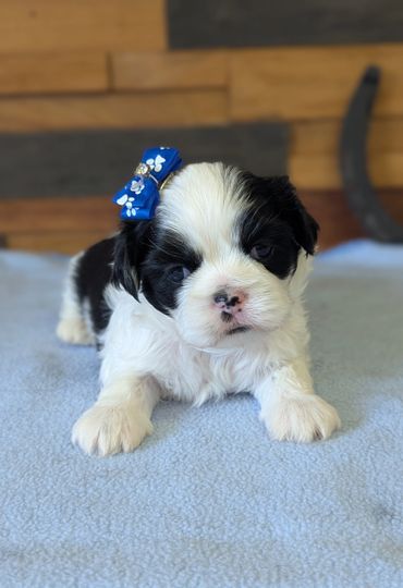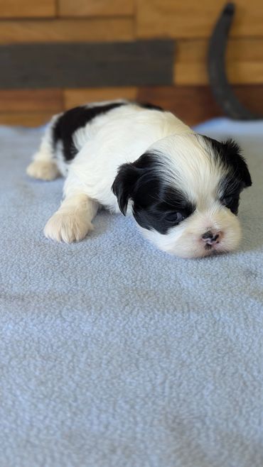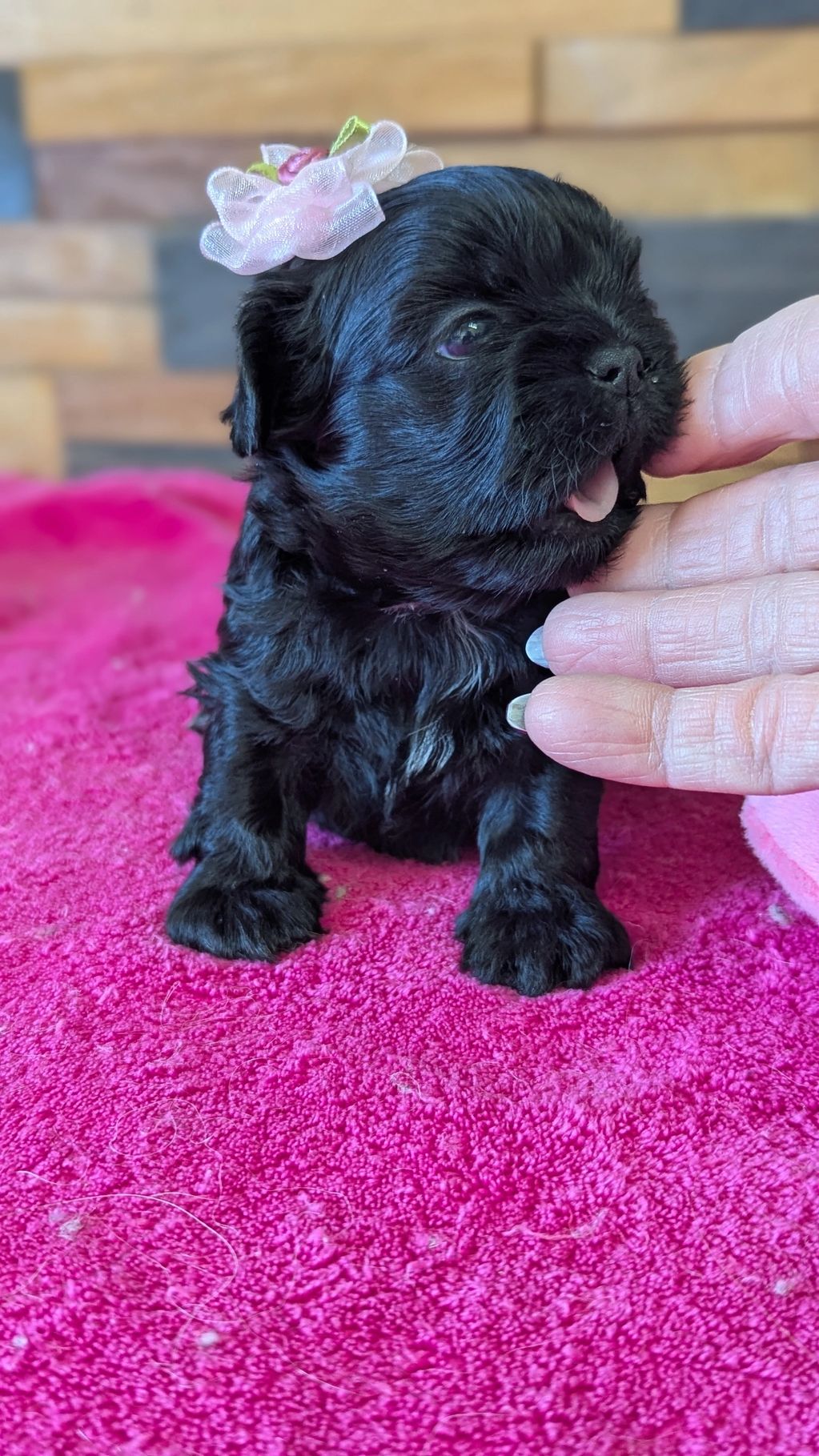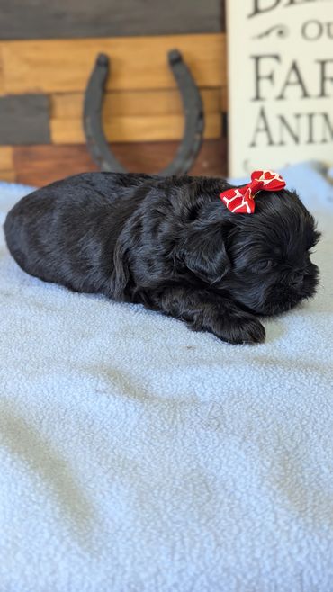 Meet Beau! He's a solid black shih Tzu puppy boy with a tiny white on his chest. He weighs 1 lb 10 ounces at 3 weeks and should mature around 9 lbs. Ready Weds before Thanksgiving.