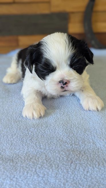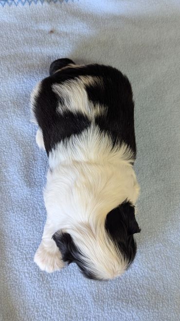 Meet Bailey! He's an adorable black and white puppy boy. He weighs 1 lb 11 ounces at 3 weeks and should mature around 9 lbs. Ready Weds before Thanksgiving!